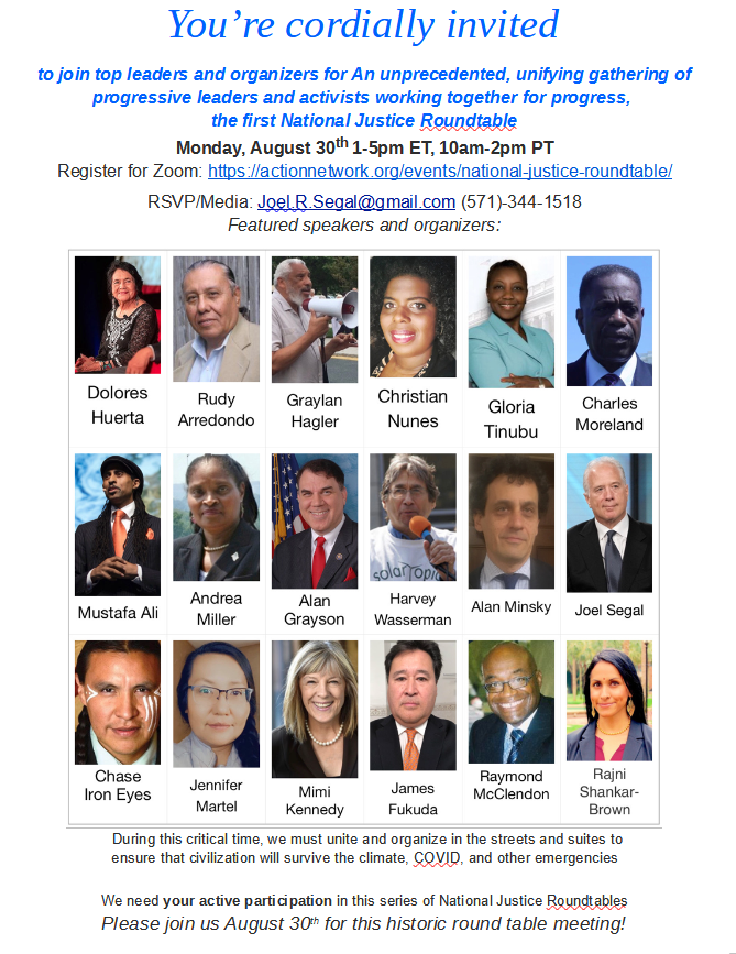 We warmly invite you to actively participate in an unprecedented gathering of progressive economic and social justice leaders, healthcare experts, community organizers, voting rights advocates, climate and green jobs activists at the Inaugural National Justice Roundtable, Monday, August 30th, from 1pm to 5pm EST, 10am-2pm Pacific Standard Time. (see list of speakers and participants below).